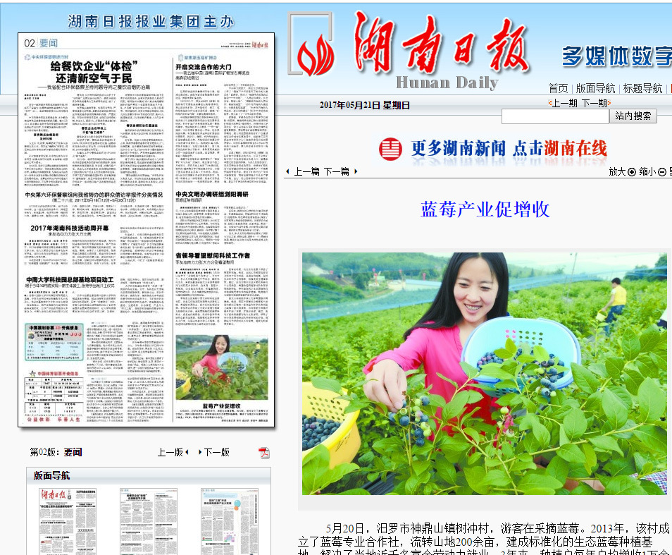 蓝莓富含花青素,作为抗氧化、抗衰老、滋养眼睛的功能性鲜果,被誉为“美瞳之果”,联合国粮农组织列其为人类五大保健食品之一,正获得越来越多消费者的青睐。“长沙市民的蓝莓消费需求很旺盛,目前的产量远远满足不了长沙水果连锁超市,以及顺丰、邮政电商平台的订单需求。”5月中旬,在距离长沙县开慧镇十余公里的神鼎山镇树冲村,黄德良牵头的益健蓝莓专业合作社,迎来了忙碌的采摘季节,也带动了周边近百名农民就业创收。